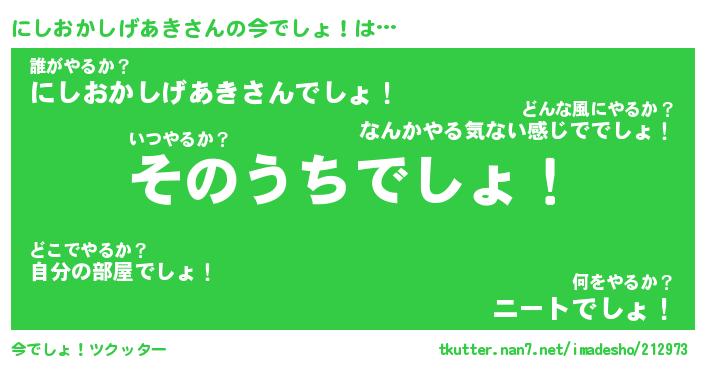 | 女子向けラノベタイトル風あだ名 | 『(仮)にしおかしげあきのやんごとなき事情』 |