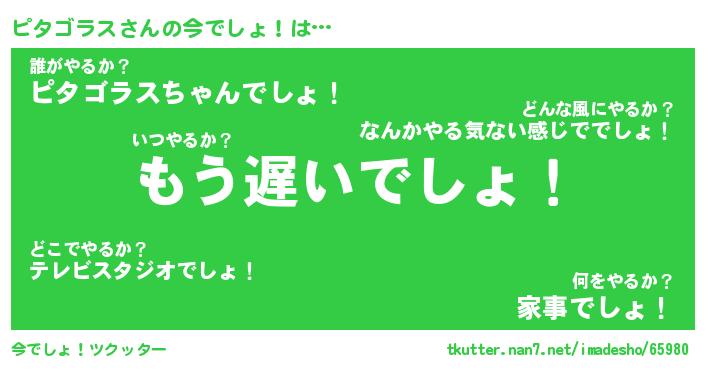 | 料理風あだ名 | 『節約★ピタゴラスと油揚げの玉子丼』 |