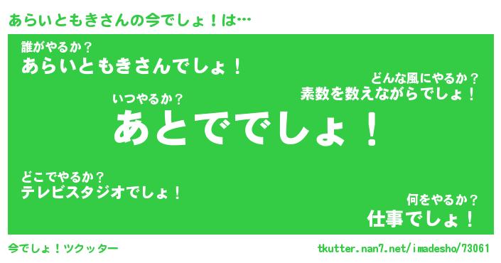 | 肩書あだ名 | 『あらいともきCEO』『あらいともき大統領』 |