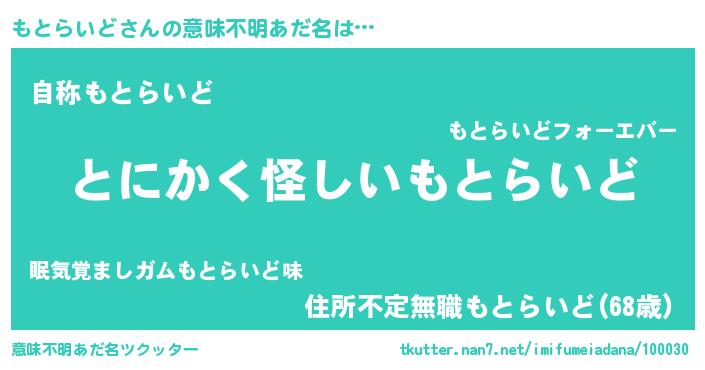| 男性向けラノベタイトル風あだ名 | 『もとらいどの嫁は女の子じゃないと思った?』 |