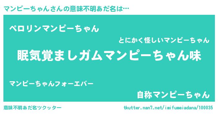 | 女子向けラノベタイトル風あだ名 | 『死神マンピーちゃんの再婚』 |