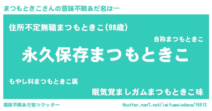 | 胡散臭い通販商品みたいなあだ名 | 『絶対に幸福をもたらす水素水…その名も「まつもときこ」』 |