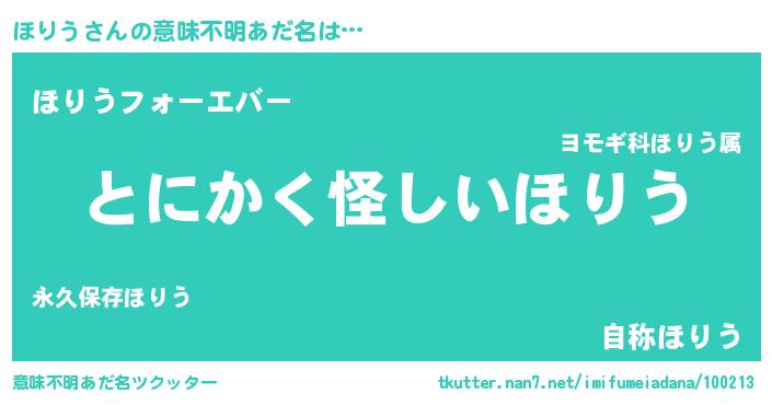 | 男性向けラノベタイトル風あだ名 | 『ダンジョンにほりうを求めるのは間違っているだろうか』 |