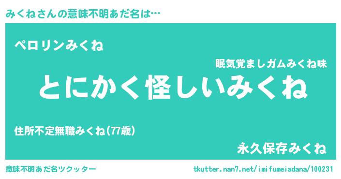 | 男性向けラノベタイトル風あだ名 | 『みくねの嫁は女の子じゃないと思った?』 |