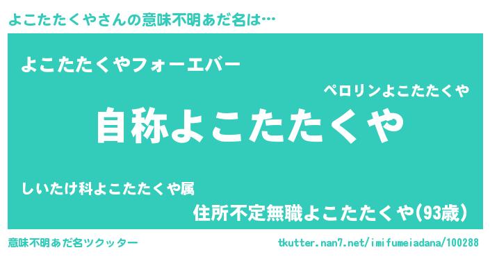 | 男性向けラノベタイトル風あだ名 | 『Re:よこたたくやから始める異世界生活』 |