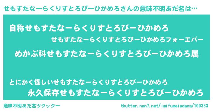 | 欧米人風あだ名 | 『トリンドルせもすたなーらくりすとろびーひかめろ』 |