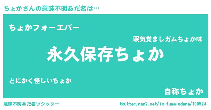 | 男性向けラノベタイトル風あだ名 | 『ちょかという概念が存在しない退屈な世界 』 |