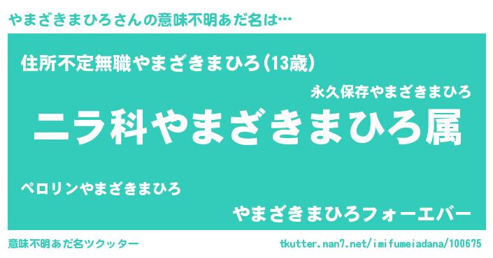 | 男性向けラノベタイトル風あだ名 | 『やまざきまひろ~年齢イコール彼女いない歴の魔法使い~』 |