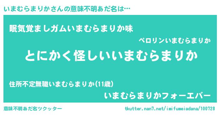 | 男性向けラノベタイトル風あだ名 | 『いまむらまりかの嫁は女の子じゃないと思った?』 |
