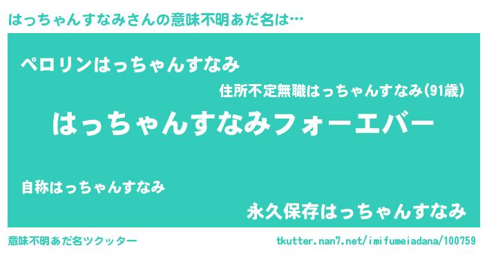 | 男性向けラノベタイトル風あだ名 | 『うちのはっちゃんすなみが世界を掌握している!』 |
