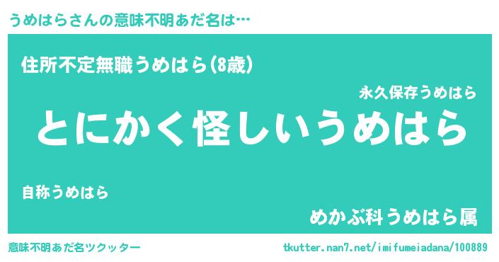 | 男性向けラノベタイトル風あだ名 | 『うめはらに滅ぼされるだけの簡単なお仕事です』 |