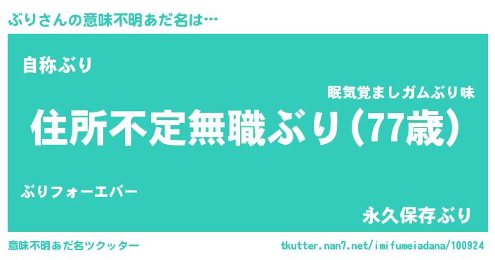| 男性向けラノベタイトル風あだ名 | 『ぶりに滅ぼされるだけの簡単なお仕事です』 |