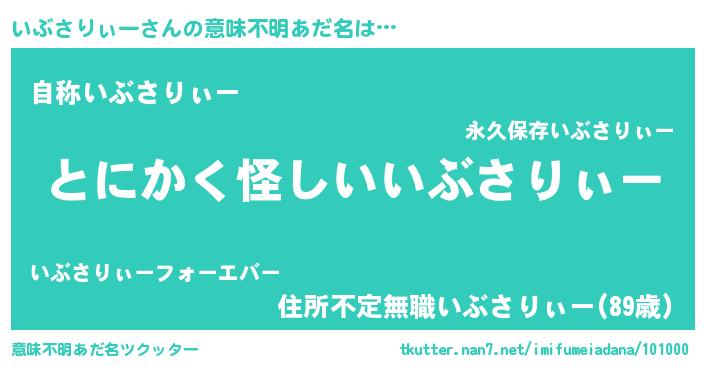 | 男性向けラノベタイトル風あだ名 | 『いぶさりぃーの嫁は女の子じゃないと思った?』 |