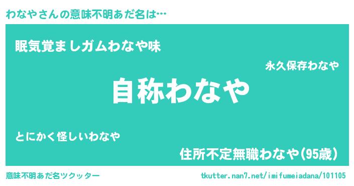 | 男性向けラノベタイトル風あだ名 | 『Re:わなやから始める異世界生活』 |