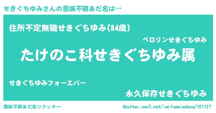 | ヘコむあだ名 | 『せきぐちゆみ(小並感)』『せきっふぃ~』 |