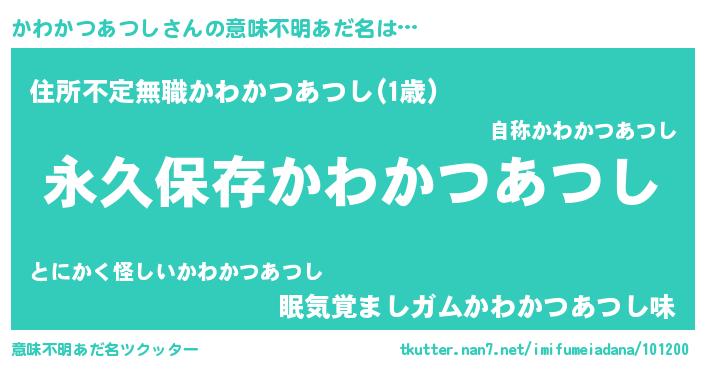 | 女子向けラノベタイトル風あだ名 | 『異世界で失敗しない100のかわかつあつし』 |