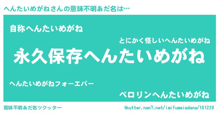 | 男性向けラノベタイトル風あだ名 | 『へんたいめがねという概念が存在しない退屈な世界 』 |