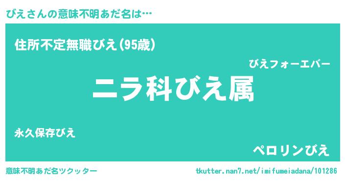 | 男性向けラノベタイトル風あだ名 | 『びえ~年齢イコール彼女いない歴の魔法使い~』 |