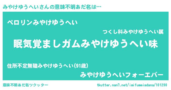 | 男性向けラノベタイトル風あだ名 | 『ノーゲーム・ノーミヤケユウヘイ』 |