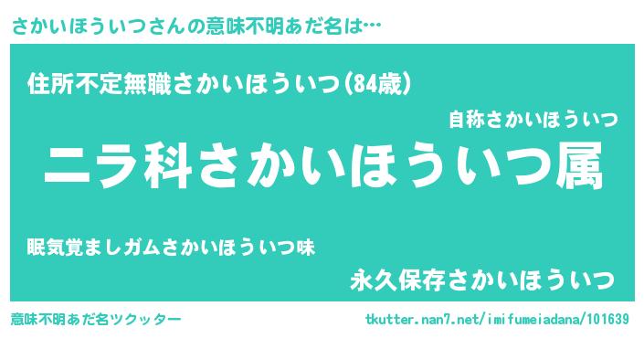| 男性向けラノベタイトル風あだ名 | 『さかいほういつ~年齢イコール彼女いない歴の魔法使い~』 |