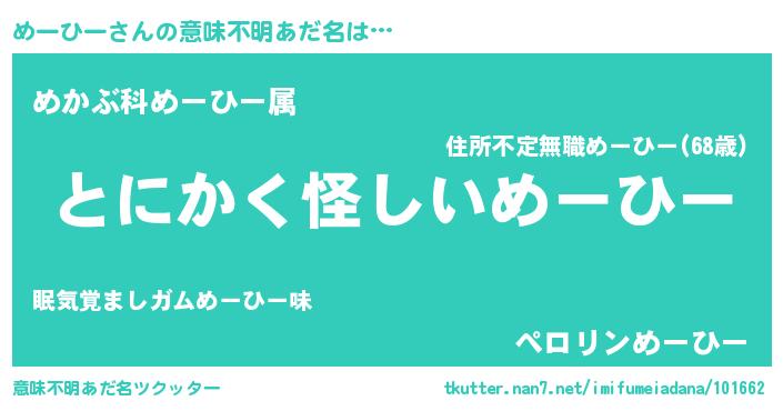 | 女子向けラノベタイトル風あだ名 | 『めーひーの卵を拾いまして』 |