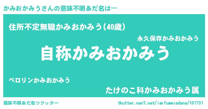 | 男性向けラノベタイトル風あだ名 | 『Re:かみおかみうから始める異世界生活』 |