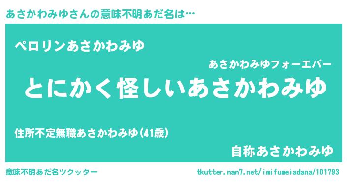 | 男性向けラノベタイトル風あだ名 | 『あさかわみゆの嫁は女の子じゃないと思った?』 |