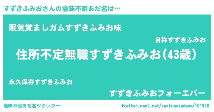 | 男性向けラノベタイトル風あだ名 | 『魔弾の王とすずきふみお』 |