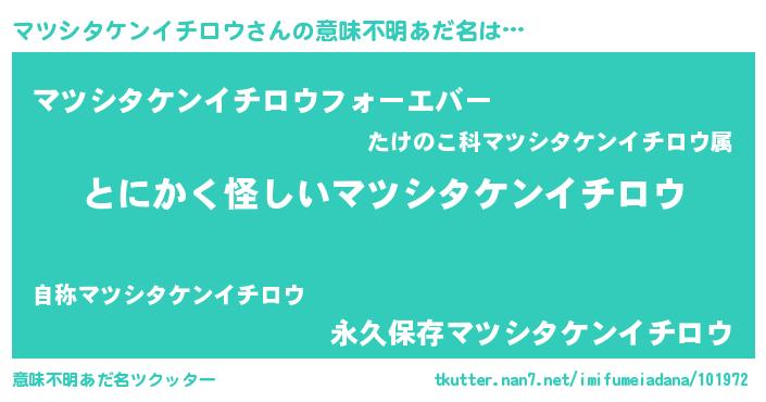 | 男性向けラノベタイトル風あだ名 | 『マツシタケンイチロウの嫁は女の子じゃないと思った?』 |