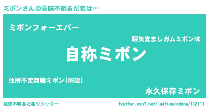 | 男性向けラノベタイトル風あだ名 | 『Re:ミボンから始める異世界生活』 |