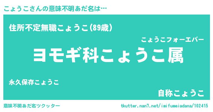 | 男性向けラノベタイトル風あだ名 | 『こょうこ~年齢イコール彼女いない歴の魔法使い~』 |