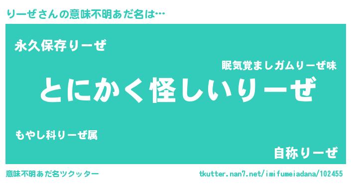 | 男性向けラノベタイトル風あだ名 | 『りーぜの嫁は女の子じゃないと思った?』 |