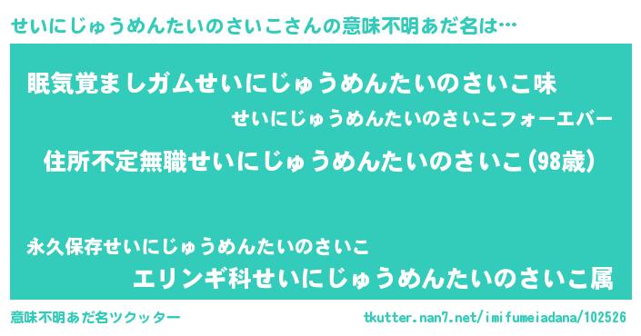 | 男性向けラノベタイトル風あだ名 | 『この素晴らしい世界にせいにじゅうめんたいのさいこを!』 |