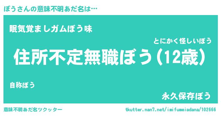| ヘコむあだ名 | 『ぼう(笑)』『ぼうぷりん』『豆乳』 |