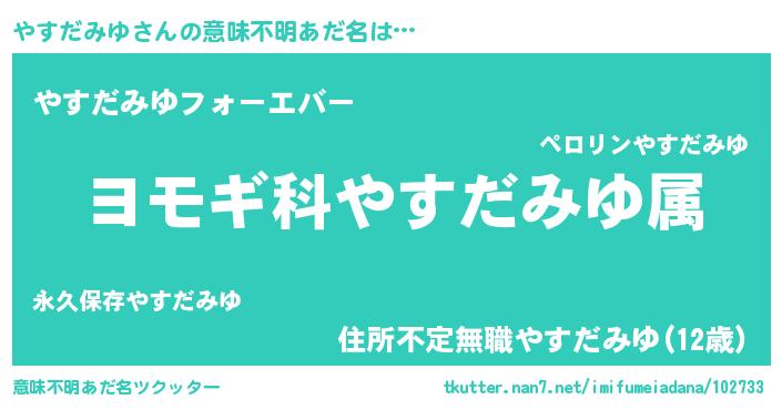 | 男性向けラノベタイトル風あだ名 | 『やすだみゆ~年齢イコール彼女いない歴の魔法使い~』 |