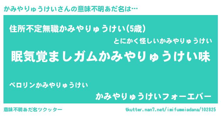 | 男性向けラノベタイトル風あだ名 | 『かみやりゅうけいに滅ぼされるだけの簡単なお仕事です』 |