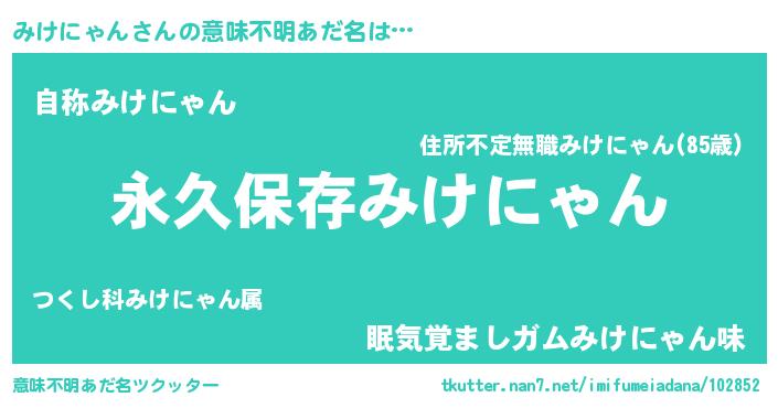 | 男性向けラノベタイトル風あだ名 | 『みけにゃんという概念が存在しない退屈な世界 』 |