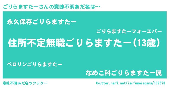 | 男性向けラノベタイトル風あだ名 | 『ごりらますたーに滅ぼされるだけの簡単なお仕事です』 |