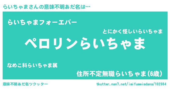 | 男性向けラノベタイトル風あだ名 | 『らいちゃまの憂鬱』 |
