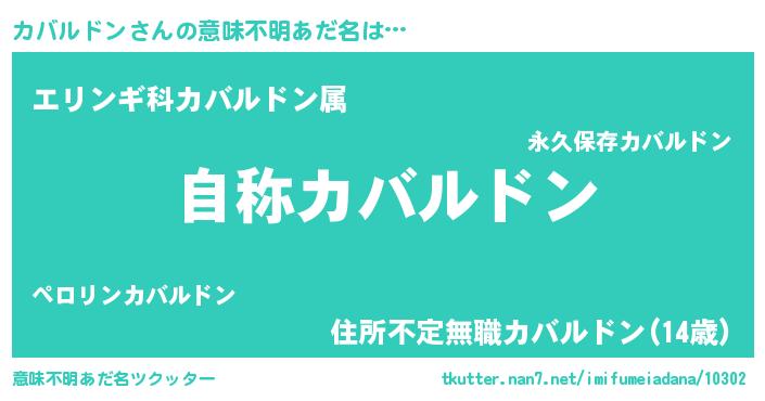 | 男性向けラノベタイトル風あだ名 | 『Re:カバルドンから始める異世界生活』 |