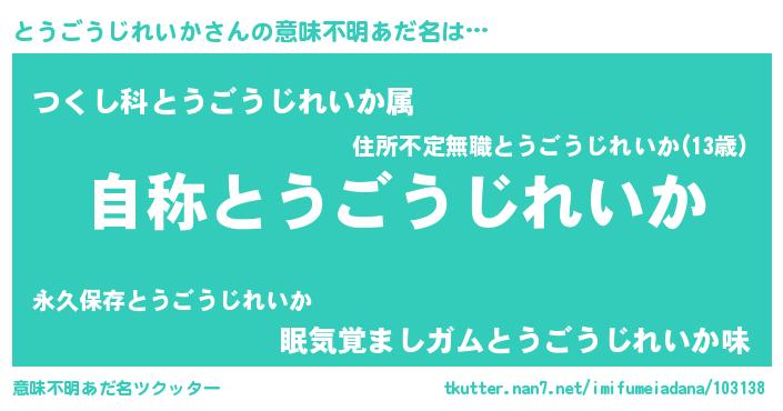 | 男性向けラノベタイトル風あだ名 | 『Re:とうごうじれいかから始める異世界生活』 |