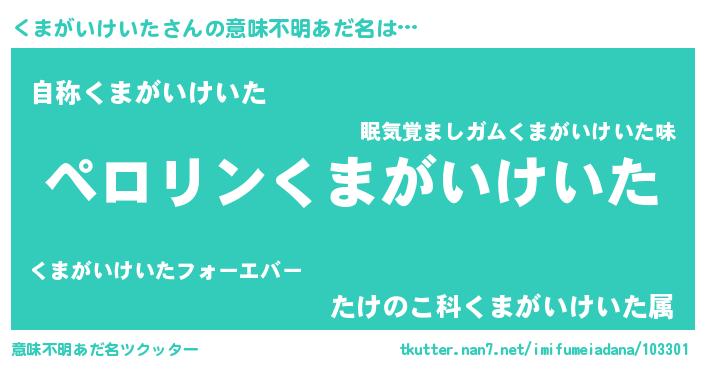 | 男性向けラノベタイトル風あだ名 | 『くまがいけいたに滅ぼされるだけの簡単なお仕事です』 |
