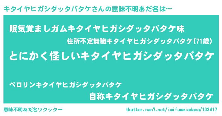 | 女子向けラノベタイトル風あだ名 | 『キタイヤヒガシダッタバタケの卵を拾いまして』 |