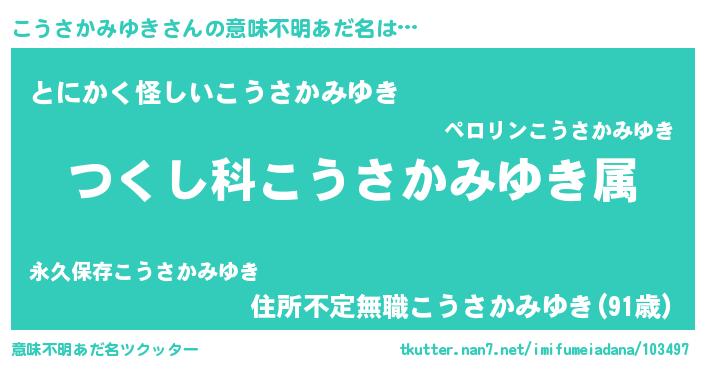| 男性向けラノベタイトル風あだ名 | 『こうさかみゆき~年齢イコール彼女いない歴の魔法使い~』 |
