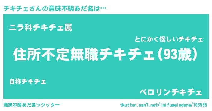 | 男性向けラノベタイトル風あだ名 | 『この素晴らしい世界にチキチェを!』 |