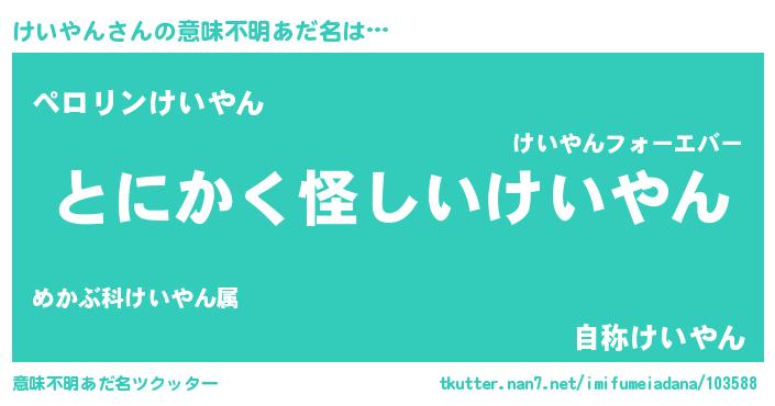 | 男性向けラノベタイトル風あだ名 | 『けいやんの嫁は女の子じゃないと思った?』 |