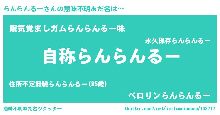 | 男性向けラノベタイトル風あだ名 | 『Re:らんらんるーから始める異世界生活』 |