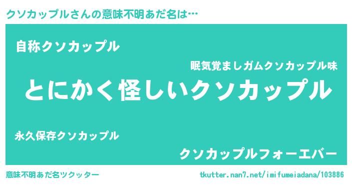 | 胡散臭い通販商品みたいなあだ名 | 『信頼と実績のサプリメント…その名も「クソカップル」』 |