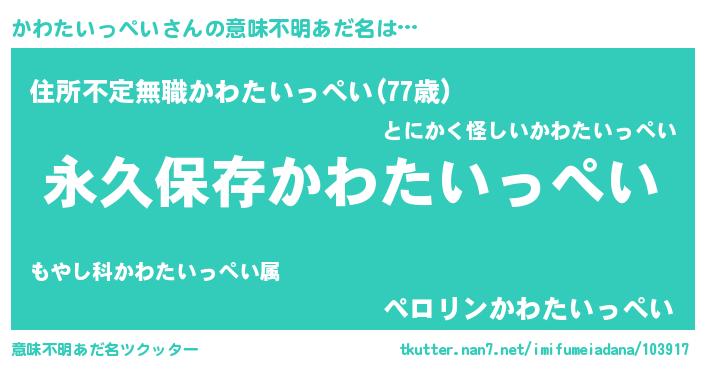 | 胡散臭い通販商品みたいなあだ名 | 『絶対に幸福をもたらす健康食品…その名も「かわたいっぺい」』 |