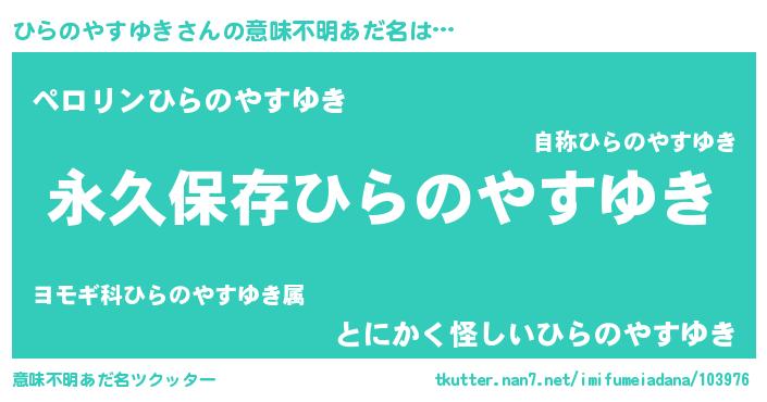 | 男性向けラノベタイトル風あだ名 | 『ひらのやすゆきという概念が存在しない退屈な世界 』 |